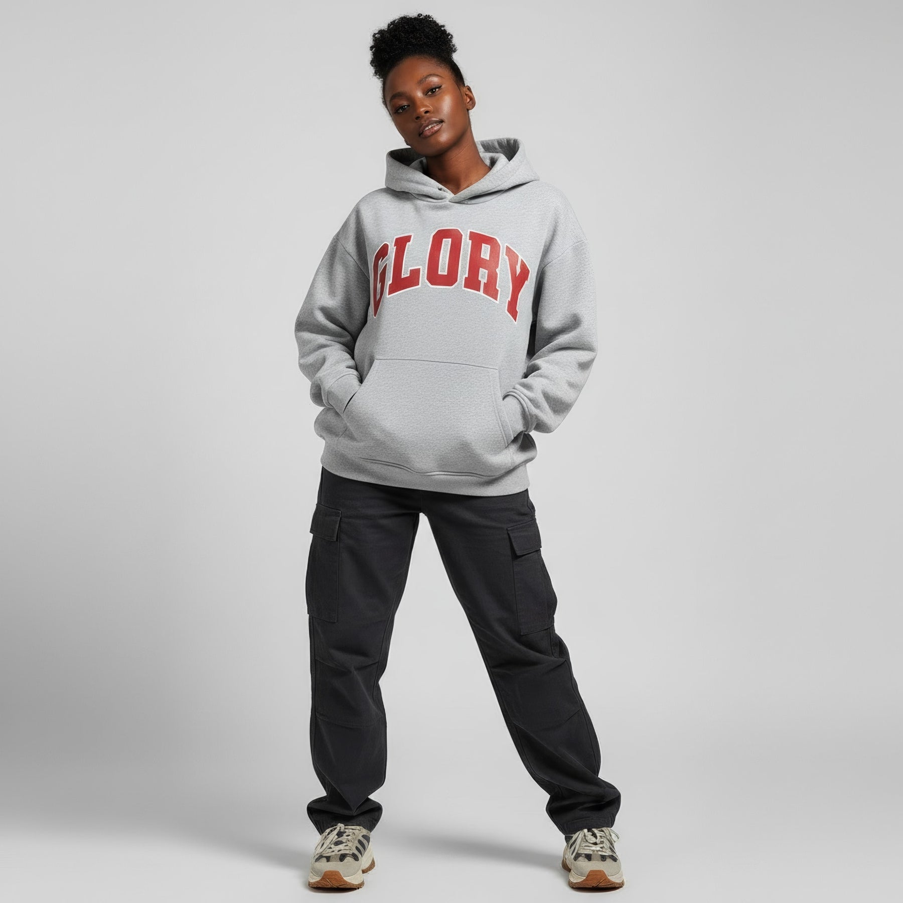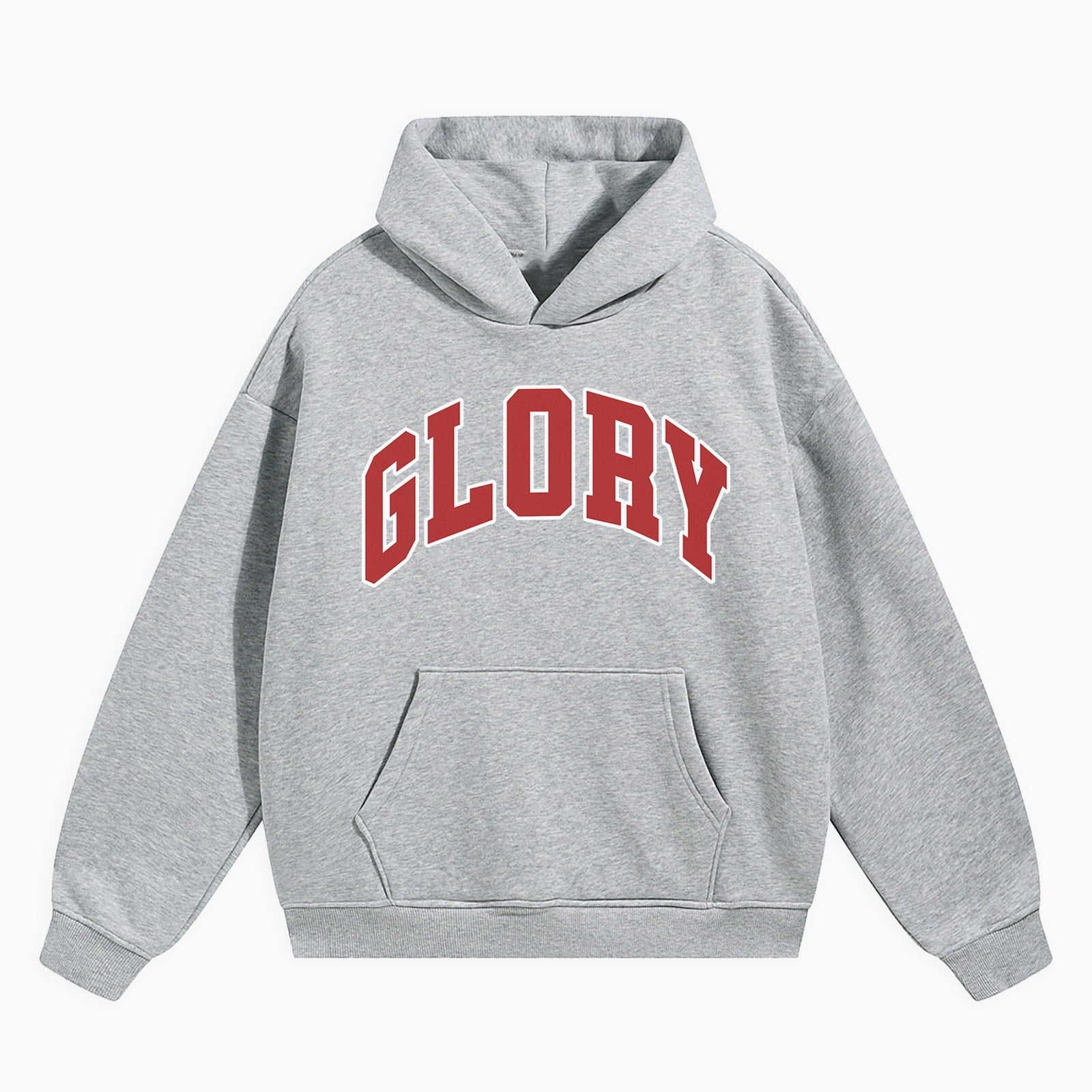 This oversized, fleece-lined hoodie features a bold “Glory” letter print on the front and is designed for ultimate cold-weather comfort.